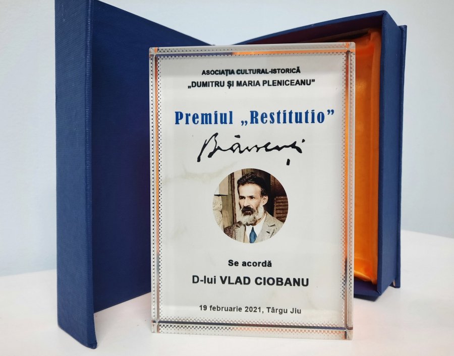Asociația cultural-istorică „Dumitru și Maria Pleniceanu” conferă, în cadrul Zilei Naționale Brâncuși, PREMIUL RESTITUTIO. BRÂNCUȘI sculptorului VLAD CIOBANU, în semn de apreciere pentru neobosita activitate dedicată operei brâncușiene și coordonării Simpozionului Internațional de Sculptură „Atelierele Brâncuși” de la Târgu Jiu.
