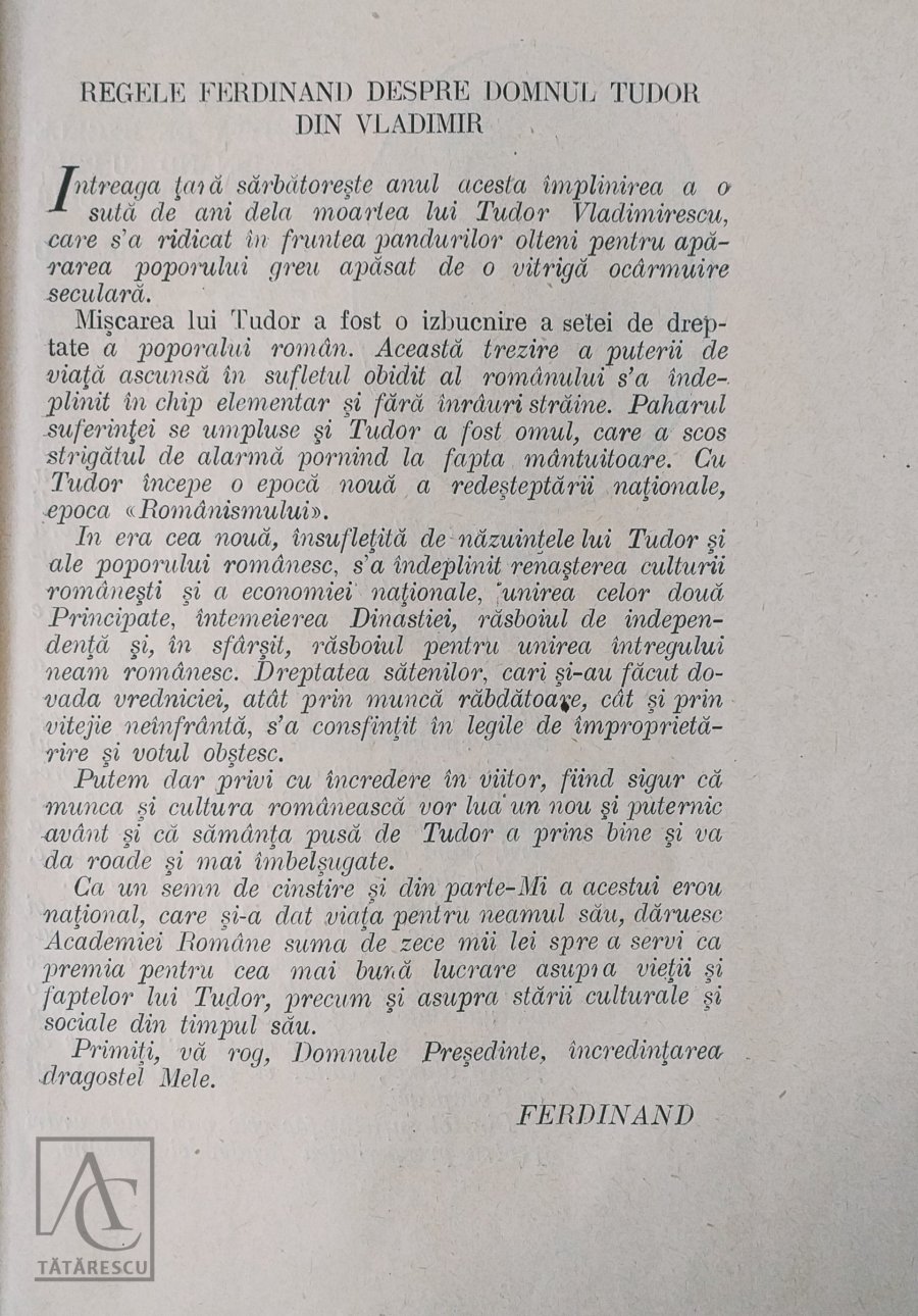 Cartea se deschide cu discursul rostit de regele Ferdinand I, în Aula Academiei Române, în anul 1921, cu ocazia aniversării centenarului Tudor Vladimirescu, „care s-a ridicat în fruntea pandurilor olteni pentru apărarea poporului greu apăsat de o vitregă ocârmuire seculară”*.