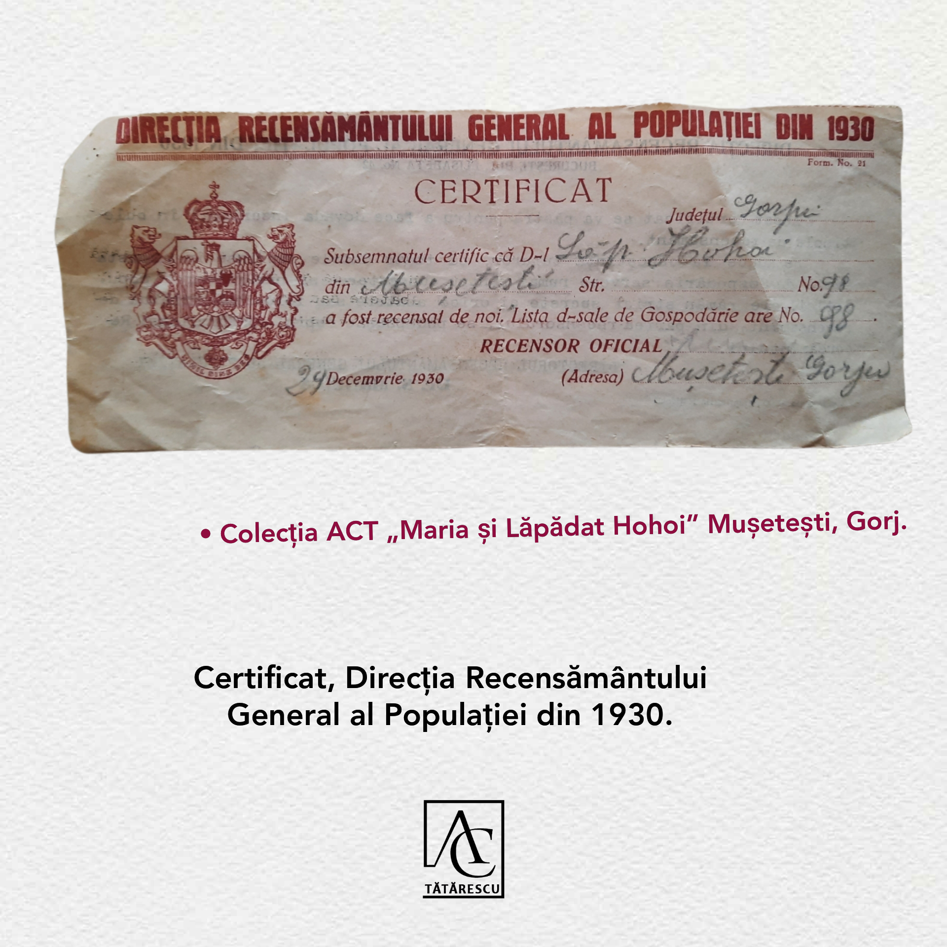 Printre documentele Colecției „Maria și Lăpădat Hohoi”, a Asociației culturale Tătărescu, se află și un Certificat de la Recensământul general al populației României din 1930, acesta fiind și primul recensământ al populației României întregite. Recensământul a fost organizat și desfășurat conform cerințelor științifice moderne ale acelei perioade. Pentru prima dată în România datele s-au prelucrat cu ajutorul echipamentelor de calcul (mecanografice). Recensământul a fost realizat la 29 decembrie 1930.