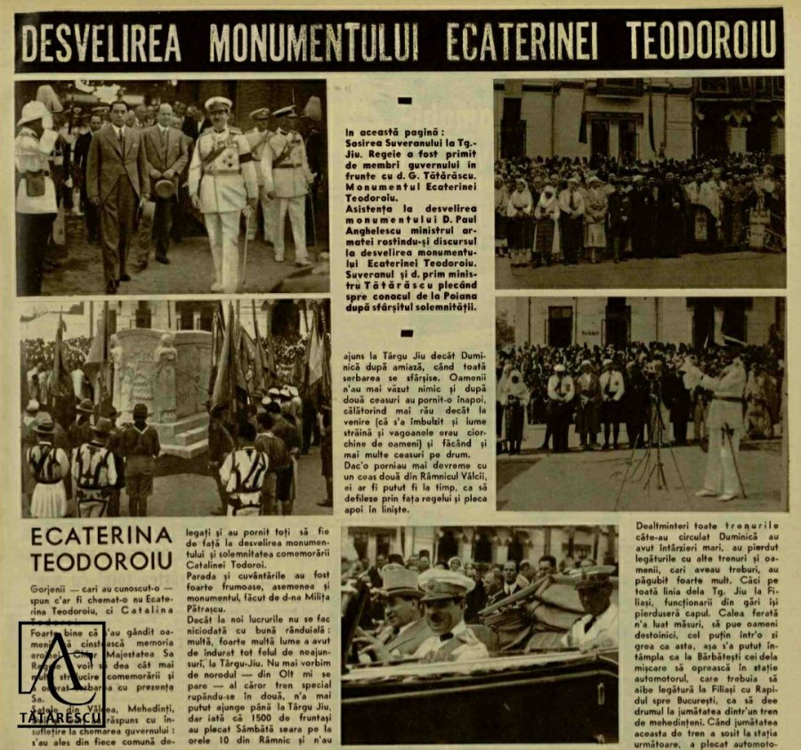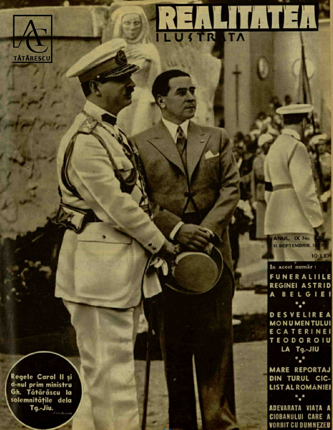 Regele Carol al II-lea și prim-ministrul Gheorghe Tătărescu, prezenți la dezvelirea monumentului eroinei Ecaterina Teodoroiu, la Târgu Jiu, în ziua de 8 septembrie 1935.