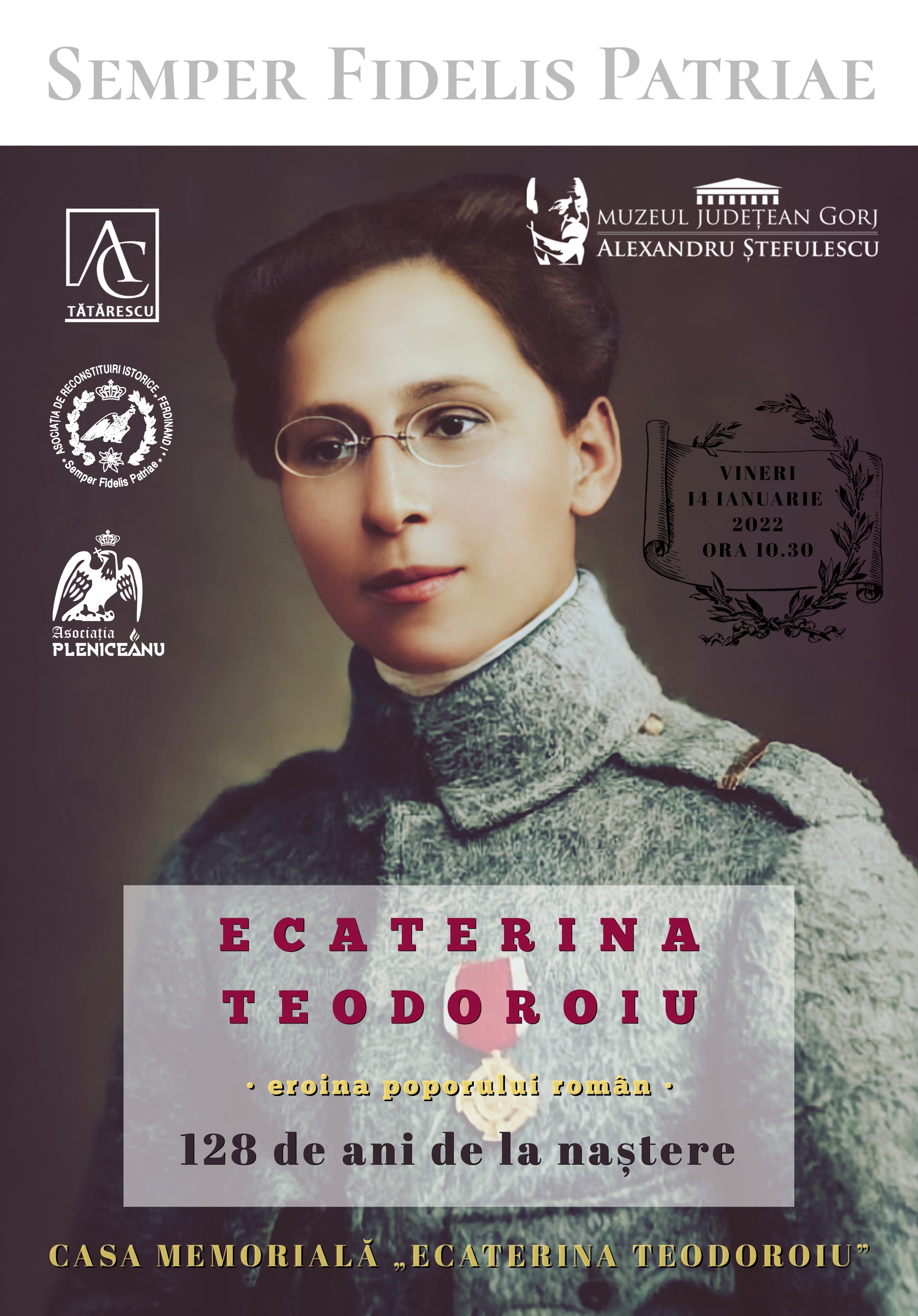 Se împlinesc în acest an, pe 14 ianuarie, 128 de ani de la nașterea Ecaterinei Teodoroiu, fiica Gorjului intrată în legendă, prin jertfa sa eroică în timpul Primului Război Mondial. Un eveniment dedicat memoriei sale va fi organizat începând cu ora 10.30, la Casa Memorială „Ecaterina Teodoroiu” din Vădeni.