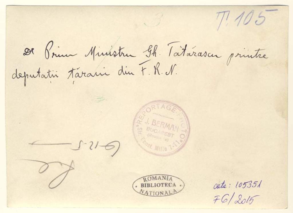 Gh. Tătărescu alături de deputaţii ţărani din Frontul Renașterii Naționale îmbrăcaţi în costume naţionale. Pe revers este plasată ştampila rotundă, de autor a lui Iosif Berman.
