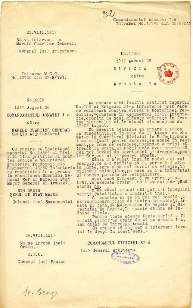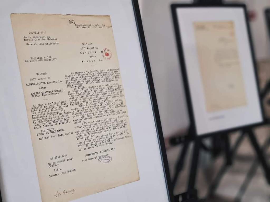 Prof. Andrei Popete Pătrașcu prezintă un document inedit din cadrul expoziției de la Târgu Jiu, în care generalul Ernest Broșteanu, comandantul Diviziei a XI-a Române, transmitea în ziua de 25 august 1917, către comandantul Armatei I-a: „Am onoarea a aduce la cunoștință, că în ziua de 17 August am chemat-o (pe Ecaterina Teodoroiu – n.n.) la Cuartierul Diviziei la Pufești, unde i-am mulțumit pentru serviciile aduse în regiment, pe zona de refacere, rugând-o a primi să treacă la spitalul mobil, unde avea ocazie să dea noi dovezi de devotament și dragoste pentru Gorjenii ei și pentru Armată.