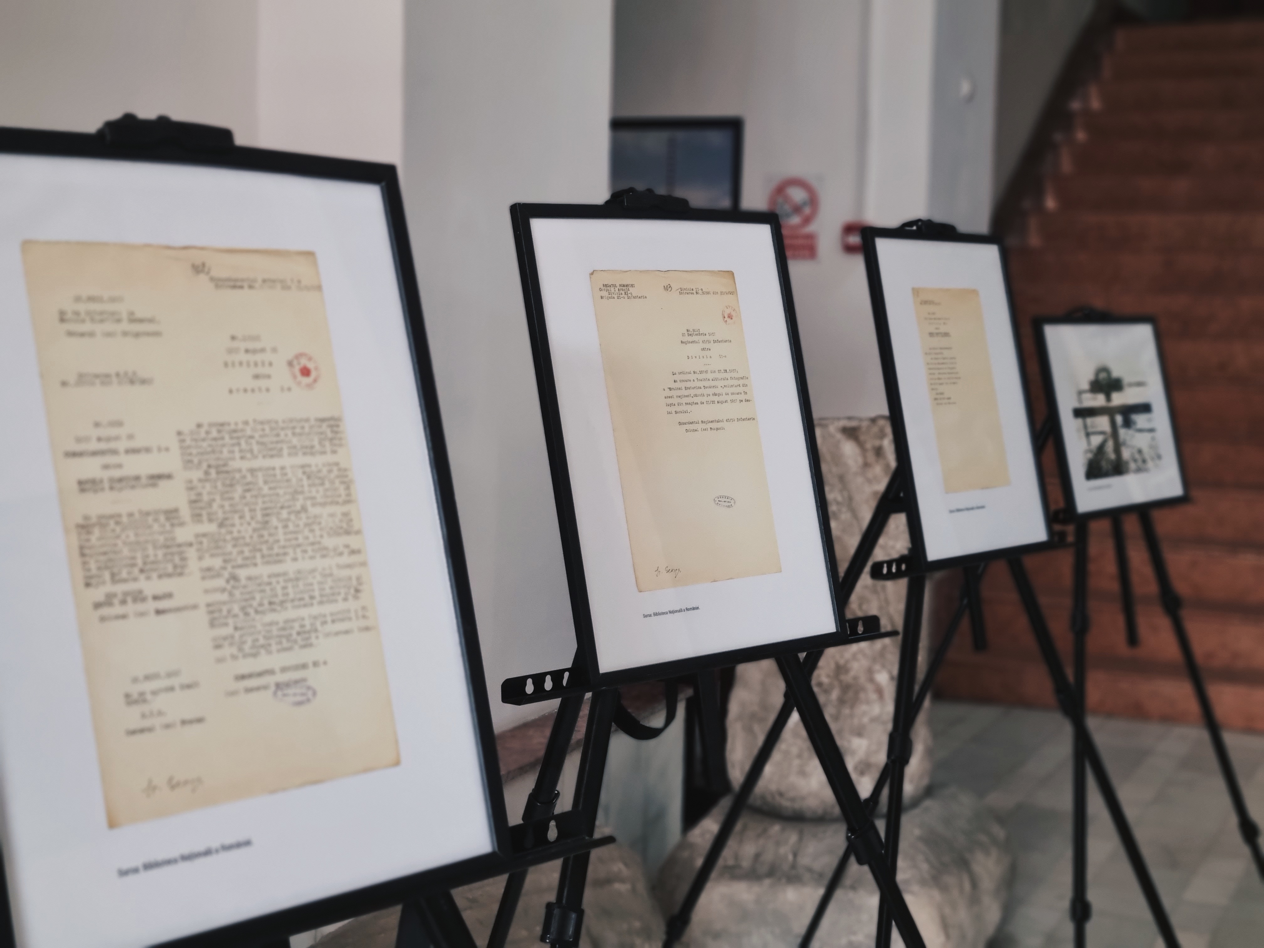Documentele principale ale expoziției prezentate în premieră pentru publicul gorjean, provin din Fondul Saint Georges al Bibliotecii Naționale a României, privind moartea eroinei Ecaterina Teodoroiu, fiind datate în perioada cuprinsă între 24 august 1917 – 3/17 ianuarie 1919. Ecaterina Teodoroiu a luptat ca voluntară în Regimentul 43/59 Infanterie și a murit pe câmpul de luptă în noaptea de 21/22 august 1917, pe Dealul Secului. Marcați de curajul ei superiorii săi ierarhici au emis de câteva ori mai multe propuneri prin care numele său să fie citat printr-un înalt ordin de zi pe Armata I-a. Documentele reprezintă rapoarte, ordine și decizii ale superiorilor ierarhici: generalul Broșteanu, comandantul Diviziei a XI-a; colonelul Anastasiu, comandantul Brigadei 21-a; colonelul Pomponiu, comandantul Regimentului 43/59 Infanterie; colonelul Rădulescu, șeful de Stat-Major al Diviziei a XI-a; colonelul Samsonovici, șeful de Stat-Major al Comandamentului Armatei I-a; colonelul [Al…?], șeful de Stat-Major General al Armatei; locotenent-colonelul Ioanide, șeful Secției a III-a Adjutantură; generalul Iliescu, reprezentantul Armatei Române pe lângă Marele Cartier Francez; generalul Prezan ș.a.