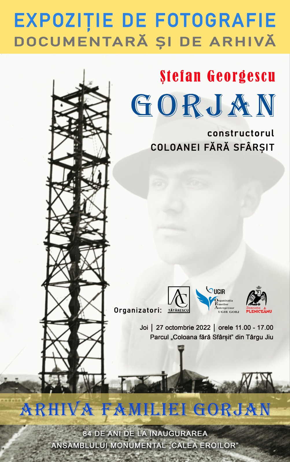 Asociația culturală Tătărescu, Asociația cultural-istorică „Dumitru și Maria Pleniceanu” și OFA UGIR Gorj vă invită să participați la evenimentul ce va avea loc în Parcul Coloanei fără Sfârșit, joi, 27 octombrie 2022, începând cu orele 11:00. Expoziția de fotografie documentară și de arhivă „Ștefan Georgescu Gorjan, constructorul Coloanei fără Sfârșit” este un omagiu adus lui Constantin Brâncuși, cu ocazia împlinirii a 84 de ani de la inagurarea Ansamblului Monumental „Calea Eroilor” și un semn de adânca prețuire pentru Stefan Georgescu Gorjan, constructorul Coloanei fără Sfârșit.