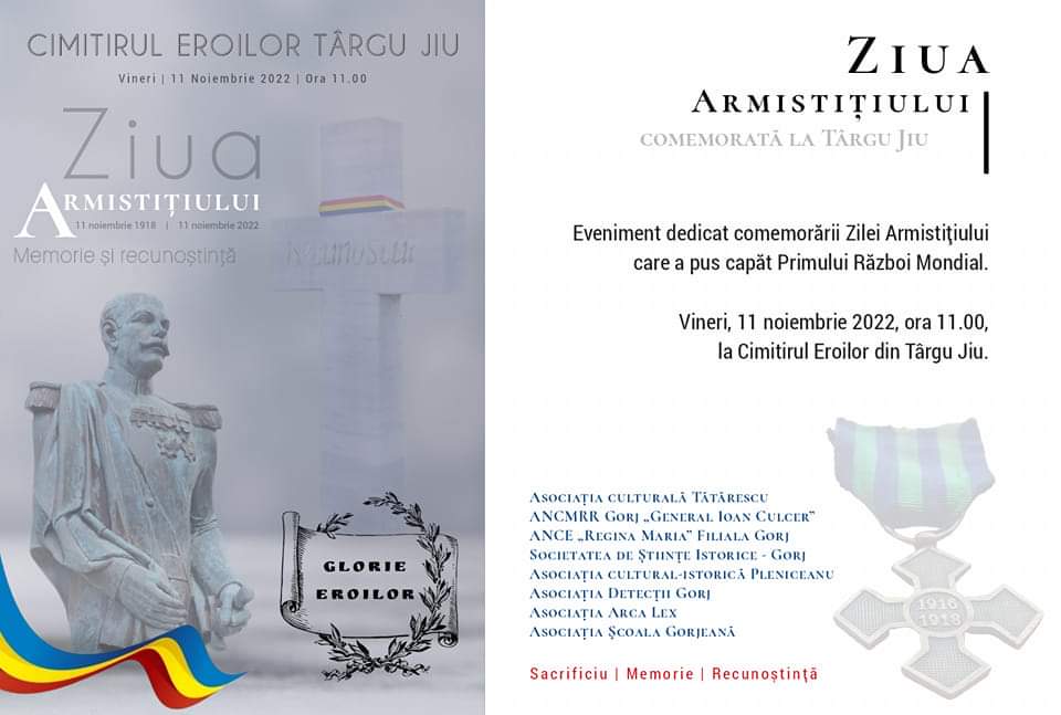 Ziua Armistițiului va fi comemorată vineri la Târgu Jiu, în Cimitirul Internațional al Eroilor, începând cu ora 11.00. Evenimentul este dedicat împlinirii a 104 ani de la semnarea armistițiului care a pus capăt Primului Război Mondial.