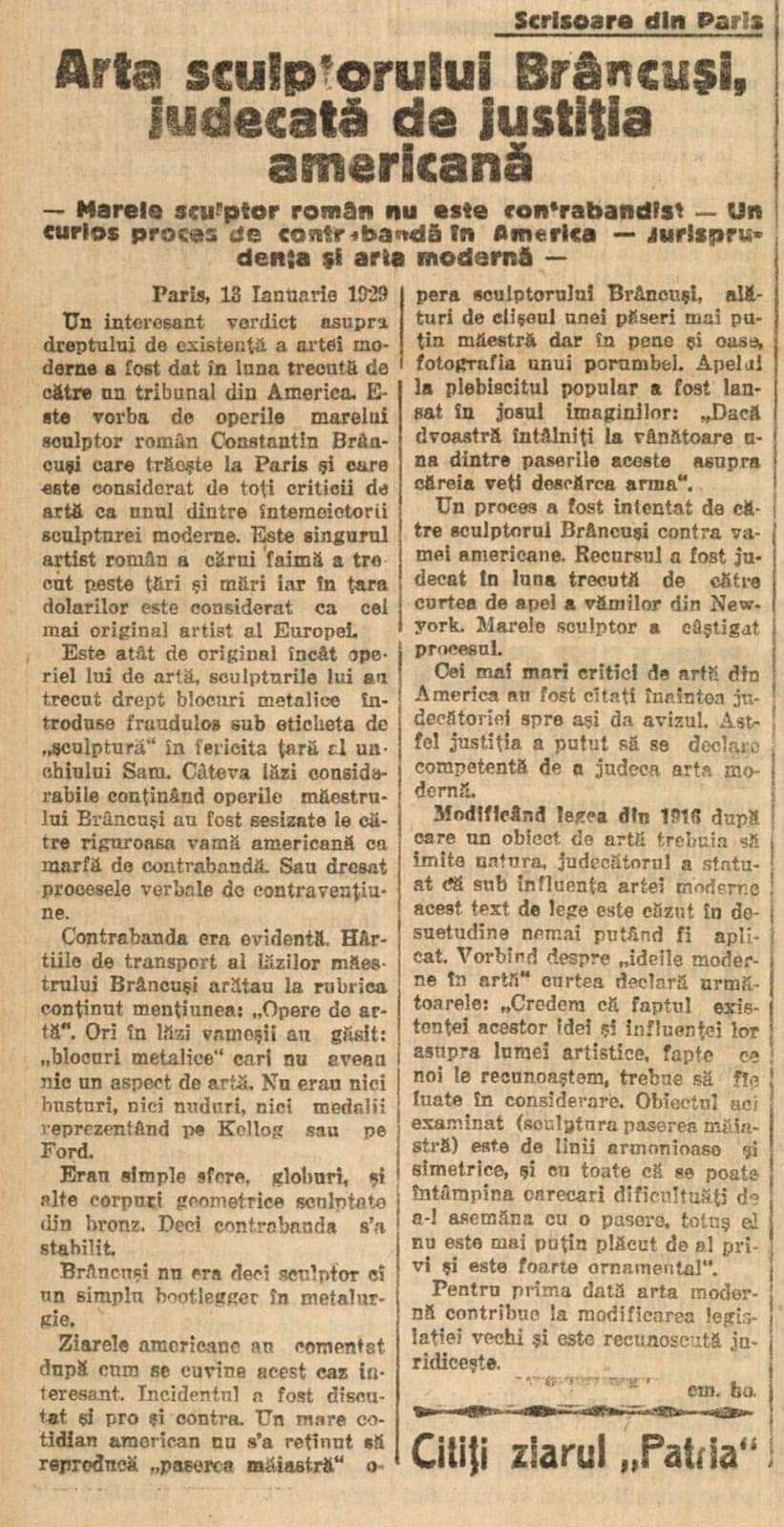 Presa românească a relatat în anul 1928 despre procesul intentat de Brâncuși vameșilor din Statele Unite ale Americii